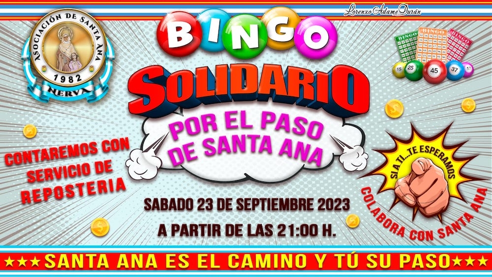 La Asociación de Santa Ana ha organizado para el próximo sábado 23 de septiembre a las 21:00 horas en la plazoleta de la barriada un Bingo Solidario con la intención de recaudar fondos que permitan la adquisición de un paso nuevo en el que procesionar la Imagen, ya que el actual se encuentra en una situación lamentable.
