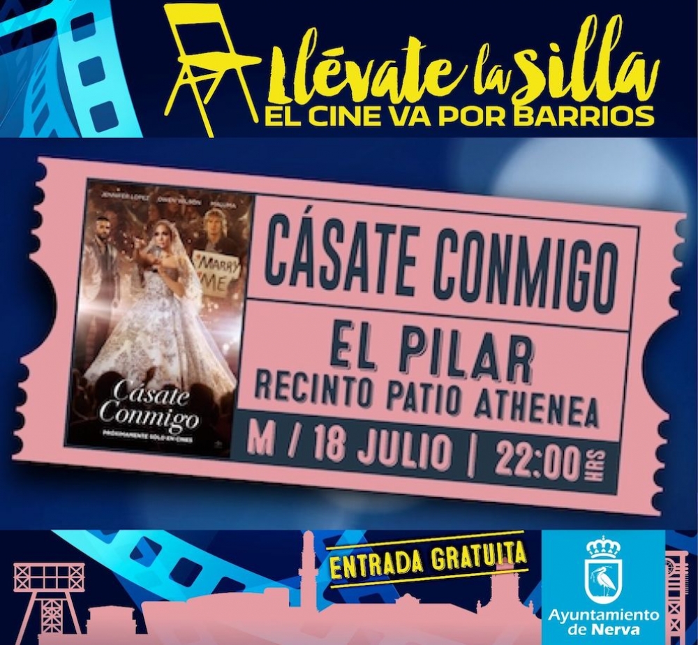 El Pilar acoge este martes 18 de julio a partir de las 22:00 horas la tercera de las seis proyecciones de cine al aire libre, ‘Llévate la silla. El cine va por barrios’, programadas desde la Concejalía de Cultura y Festejos del Ayuntamiento de Nerva para este verano. La película prevista para la sesión de esta noche es ‘Cásate conmigo’. Se proyectará en el patio de la sede de la Asociación para personas con discapacidad Athenea. La entrada es gratuita, solo tienes que llevarte la silla.