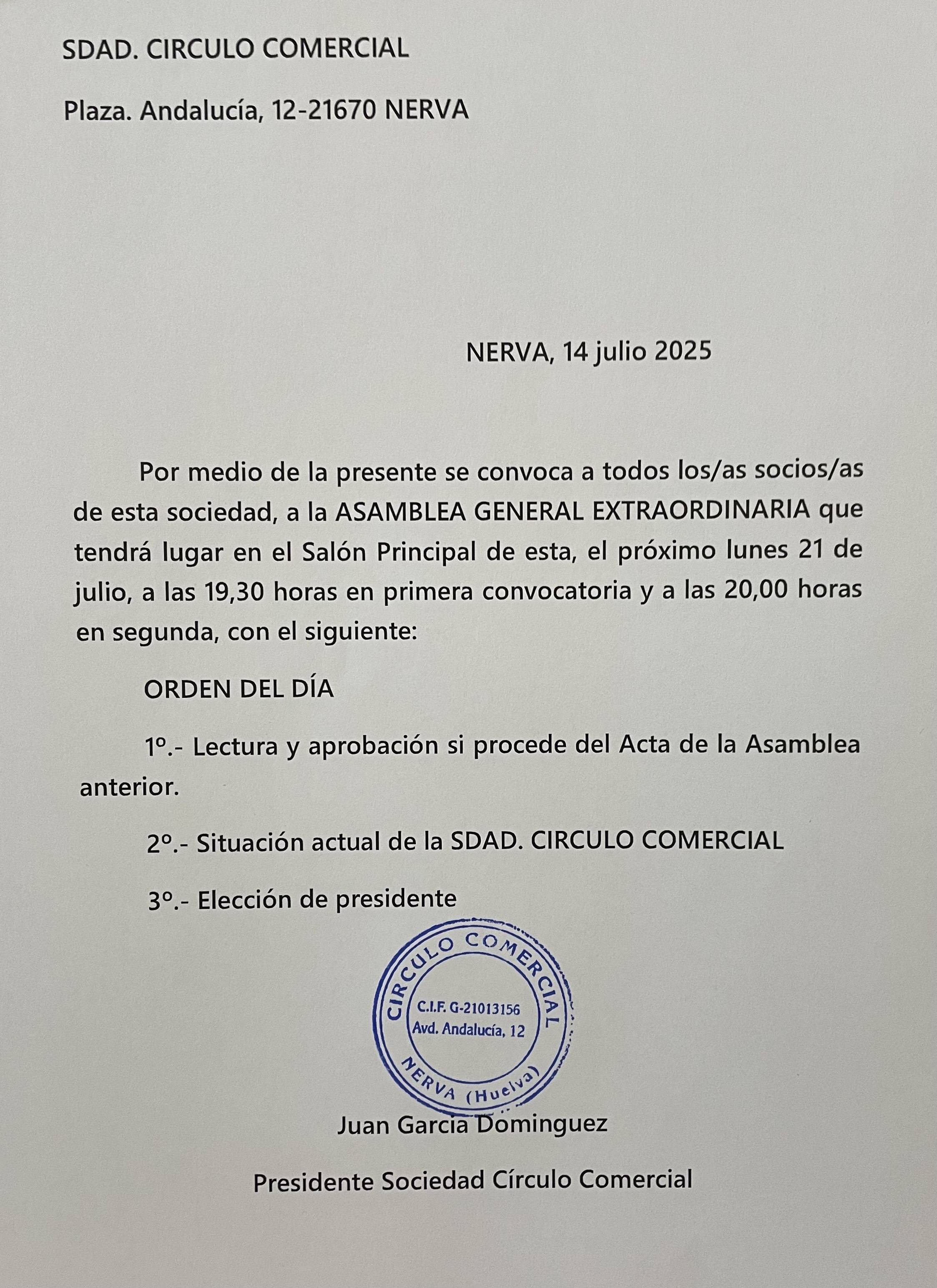 La Sociedad Círculo Comercial de Nerva, más conocida popularmente por ‘Mercantil’, celebrará Asamblea General Extraordinaria de socios el próximo lunes 21 de julio a las 19:30 horas, “tras 17 años sin convocatorias”, para tratar la situación actual de la sociedad y elegir nuevo presidente, con Francisco José Gallardo Senra, socio nº838, como único aspirante hasta el momento.