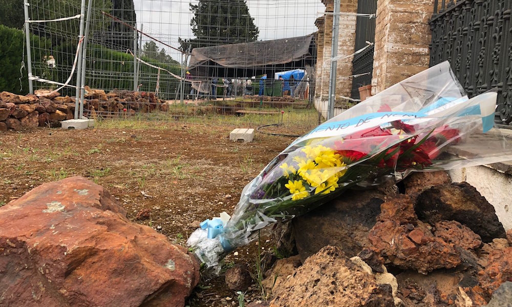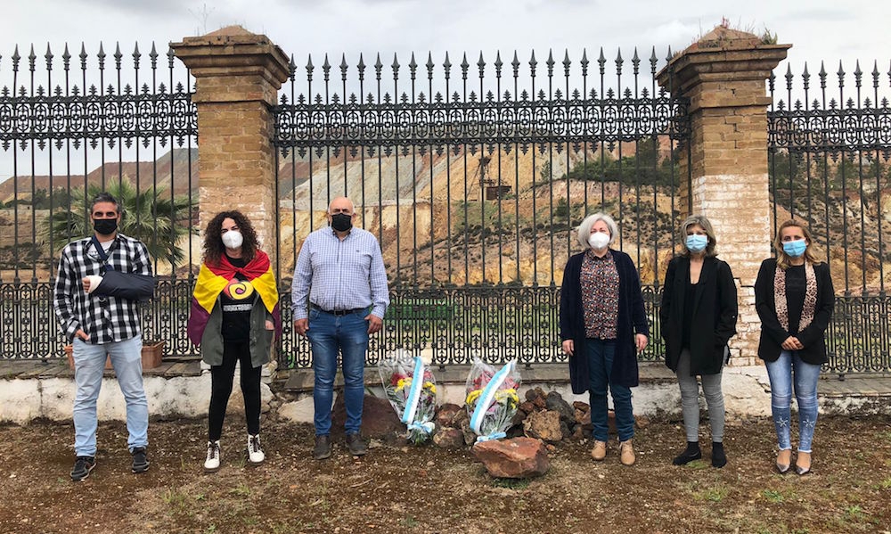 Concejales socialistas y de la formación Izquierda Unida-Adelante Nerva, junto a miembros de la Coordinadora Cuenca Minera del Río Tinto para la Memoria Histórica conmemoran el 90 aniversario de la proclamación de la II República con una ofenda floral a las víctimas del fascismo en las fosas comunes del cementerio de Nerva, la más grande de la Andalucía rural, donde un equipo de arqueólogos trabaja en la exhumación de los restos para devolvérselos a sus familiares.
