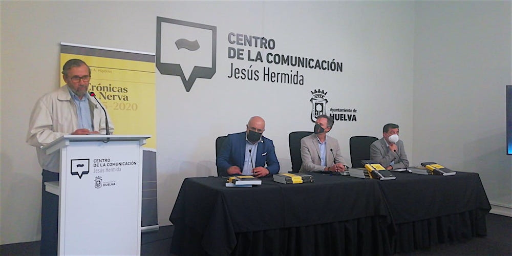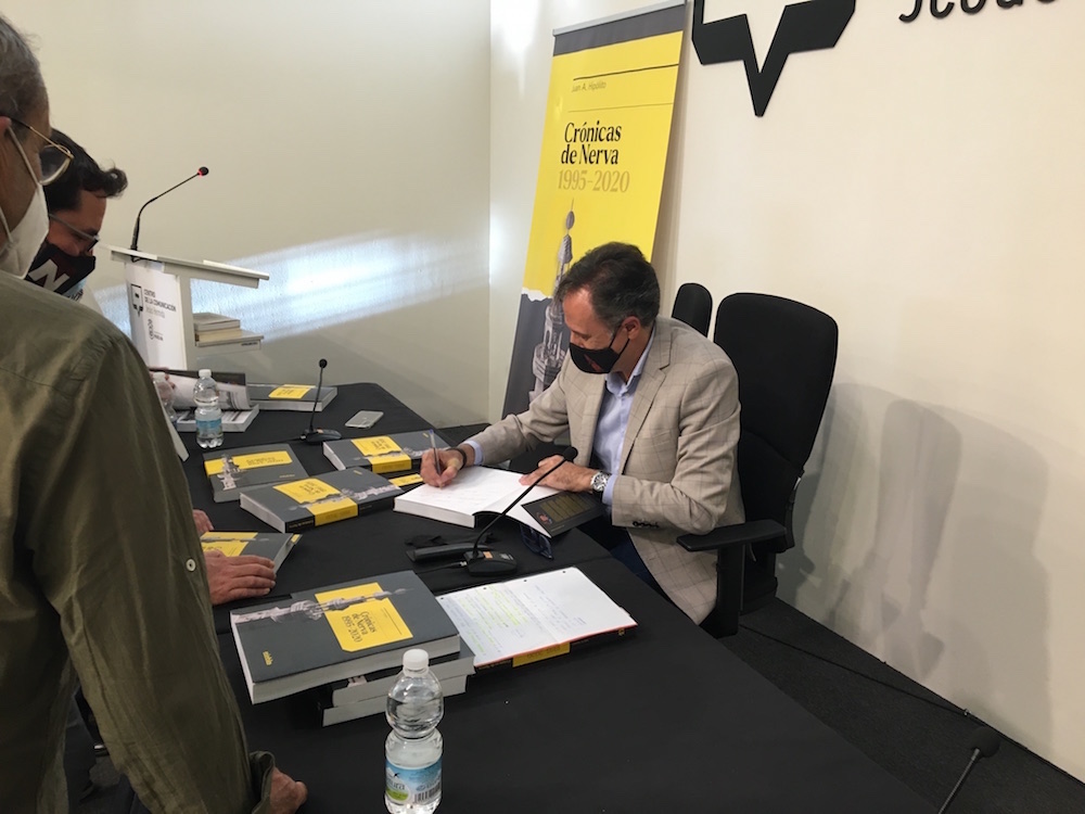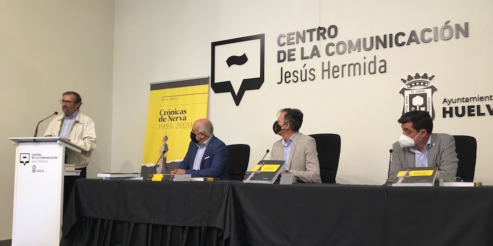 El periodista nervense Juan Antonio Hipólito, director de Onda Minera RTV Nerva y corresponsal de Huelva Información, ha presentado su nuevo libro, Crónicas de Nerva 1995-2020 (Editorial Niebla, 2021), en el Centro de la Comunicación Jesús Hermida de Huelva, acompañado por los periodistas Rafael Terán y Eduardo Sugrañes, responsable del centro de comunicación y jefe de sección del diario onubense, respectivamente, además del alcalde de Nerva, José Antonio Ayala. La obra está impulsada por el Ayuntamiento de Nerva con el patrocinio de la Fundación Atalaya Riotinto.