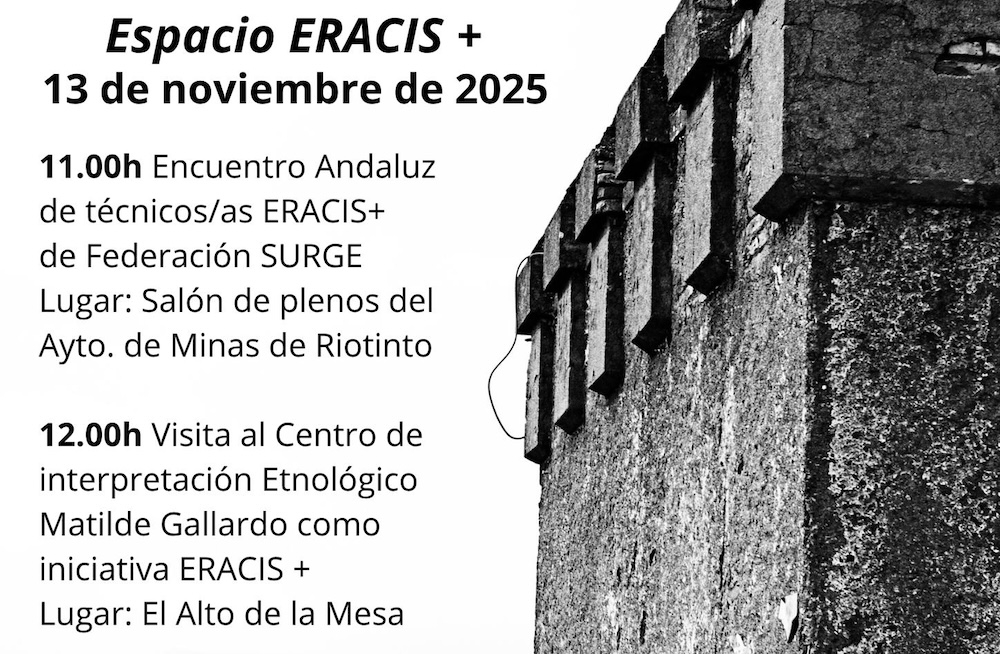 Minas de Riotinto acogerá el próximo jueves 13 de noviembre a partir de las 11:00 horas en el salón de plenos del Ayuntamiento un encuentro andaluz de técnicos ERACIS+ de la Federación SURGE donde compartirán todo tipo de experiencias y buenas prácticas en el marco proyecto “La cuenca actúa +”.