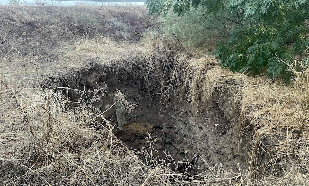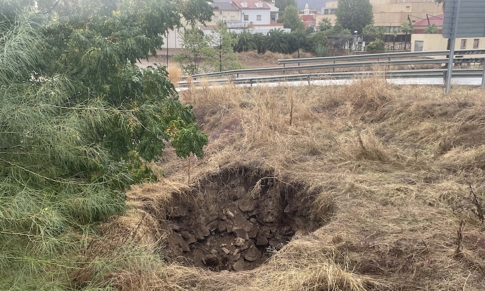 Las fuertes lluvias registradas esta mañana en Nerva han provocado un gran socavón de cinco metros de diámetro y otros cinco de profundidad en la zona del antiguo Matadero Municipal a la altura de la entrada a la localidad por la A-476. El hundimiento del terreno ha causado la inundación parcial de la zona trasera del Pabellón Municipal de Deportes Urbano Ortiz al colapsar el desagüe del colector.