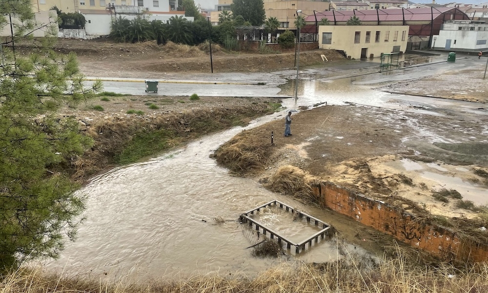 Momentos antes de producirse el socavón, la misma tromba de agua caída esta mañana desbordaba la carretera HU-5011 a su paso por el Campos de Fútbol Marismillas.