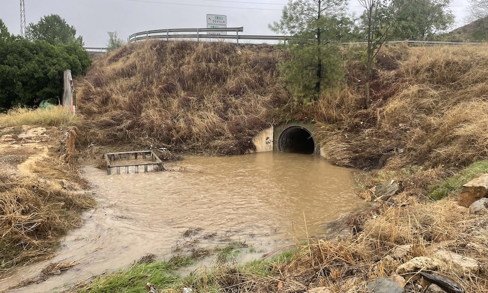 Las fuertes lluvias registradas esta mañana en Nerva han provocado un gran socavón de cinco metros de diámetro y otros cinco de profundidad en la zona del antiguo Matadero Municipal a la altura de la entrada a la localidad por la A-476. El hundimiento del terreno ha causado la inundación parcial de la zona trasera del Pabellón Municipal de Deportes Urbano Ortiz al colapsar el desagüe del colector. Se ha activado el Plan de Emergencias Local.