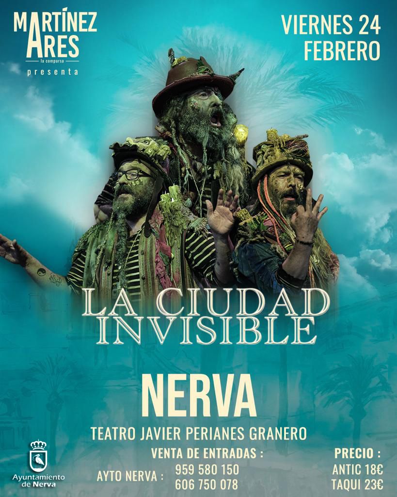 Este año el Teatro Javier Perianes Granero de Nerva volverá a abrir sus puertas por Carnaval para acoger el viernes 24 de febrero, a partir de las 19:00 horas, la actuación de la comparsa de Antonio Martínez Ares “La Ciudad Invisible”, una agrupación que quiere revalidar este año el primer premio conseguido en el anterior concurso con ‘Los Sumisos’.