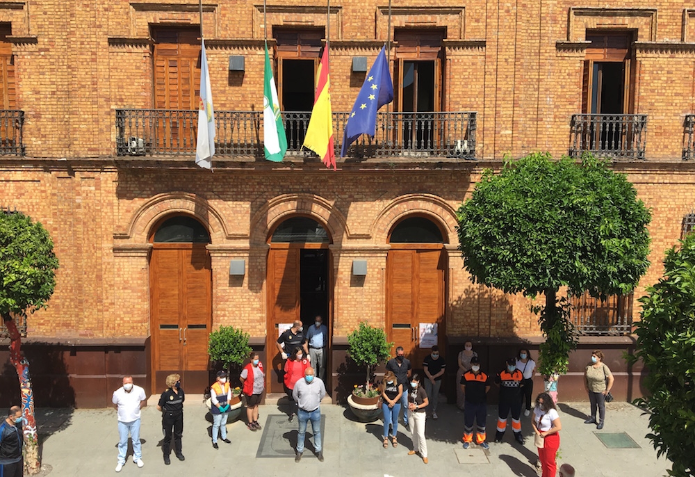 Trabajadores del Ayuntamiento de Nerva han secundado este mediodía el minuto de silencio en memoria de las víctimas del coronavirus. Se trata del primer acto de homenaje que se realiza en memoria de los fallecidos por la pandemia a nivel nacional, dentro del luto oficial de 10 días aprobado por el Consejo de Ministros. El alcalde de Nerva, José Antonio Ayala, junto a otros ediles de la corporación municipal, se ha sumado al acto que ha tenido lugar en la puerta principal de la Casa Consistorial.