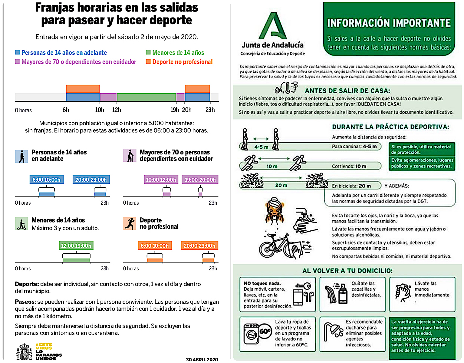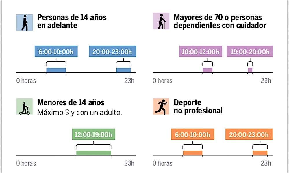 - De 06.00 a 10.00 horas y de 20.00 a 23.00 horas: Para hacer deporte y dar paseos en mayores de 14 años.