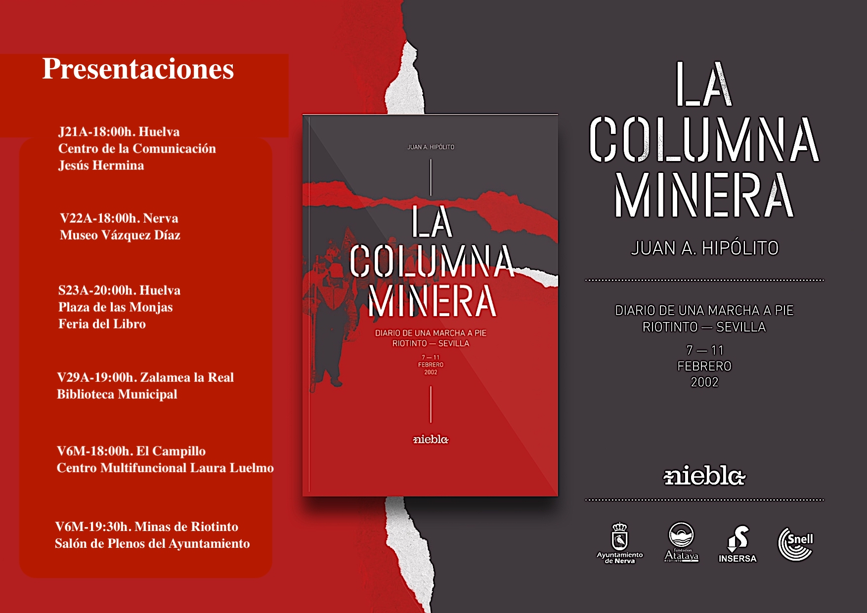 Tras esta primera presentación en Huelva, la obra, que cuenta con el patrocinio de la Fundación Atalaya Riotinto, Insersa y Snell Cuenca Minera, se presentará también en los municipios de la comarca que aportaron mayor número de mineros a la columna (los días 22 y 29 de abril en Nerva y Zamalea la Real; y en Minas de Riotinto y El Campillo el 6 de mayo). Y el sábado 23 de abril volverá a Huelva para participar en 46 edición de la Feria del Libro.
